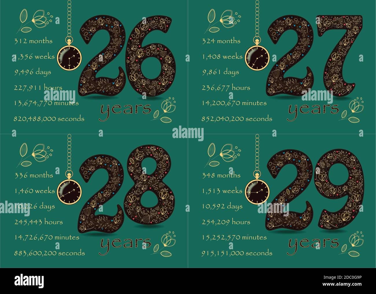 Birthday anniversary cards set. Number 26, 27, 28, 29 with yellow